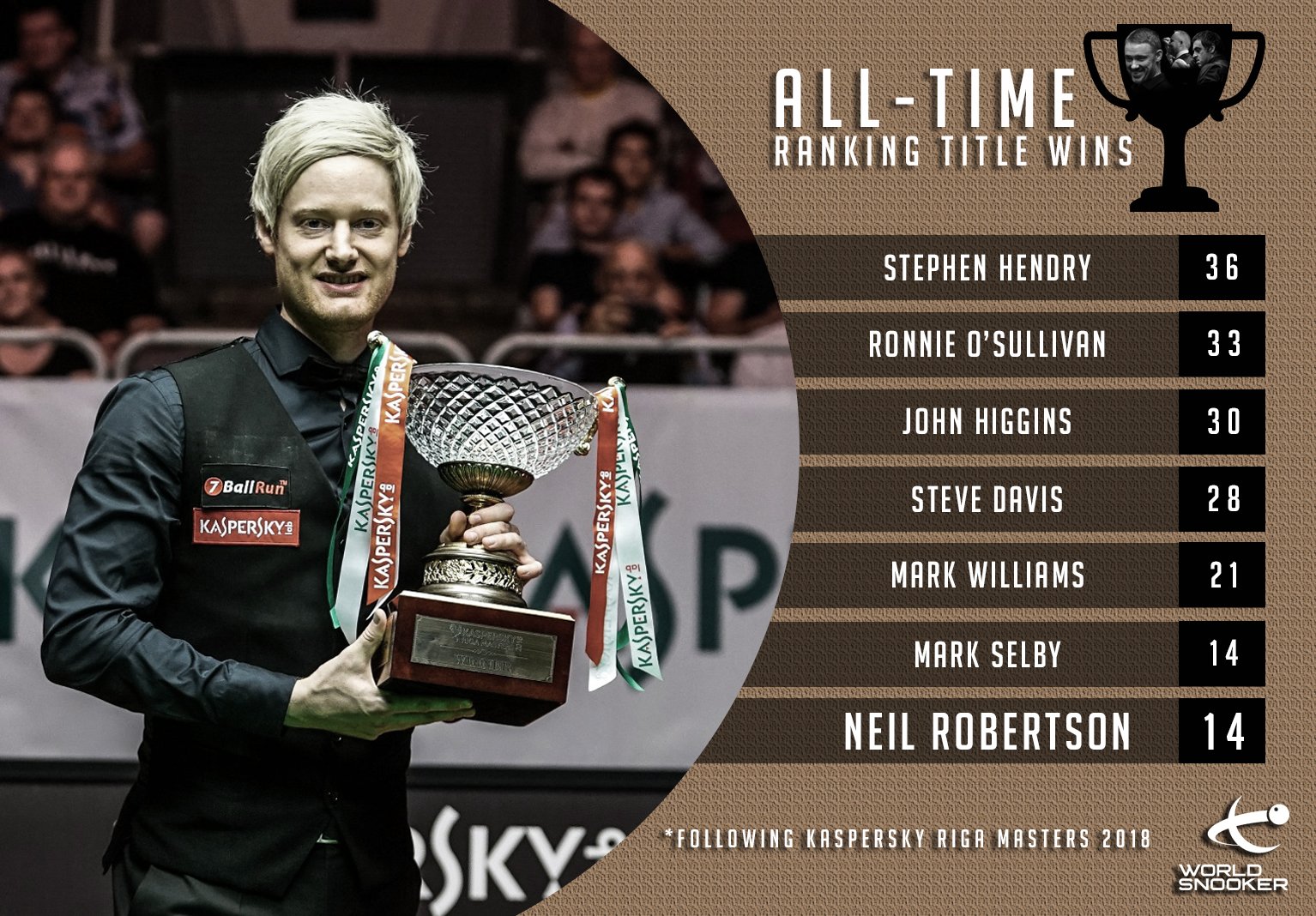 Австралиец Нил Робертсон в финале Kaspersky Riga Masters 2018 уверенно обыграл английского игрока Джека Лисовски со счётом 5:2 ! Это четырнадцатая (14-я) рейтинговая победа Нила Робертсона. Догнал таки Селби ;-)